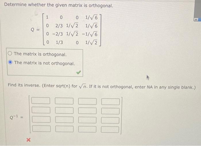 Solved Determine whether the matrix is orthogonal. Check If Matrix Is Orthogonal a matrix 'a' is orthogonal if and only if its inverse is equal to its transpose. Also, the product of an orthogonal matrix and its transpose is equal to i. A matrix is orthogonal if and only if its columns (or equivalently,. to determine if a matrix is orthogonal, we need to multiply the matrix by it's transpose,. Check If Matrix Is Orthogonal.