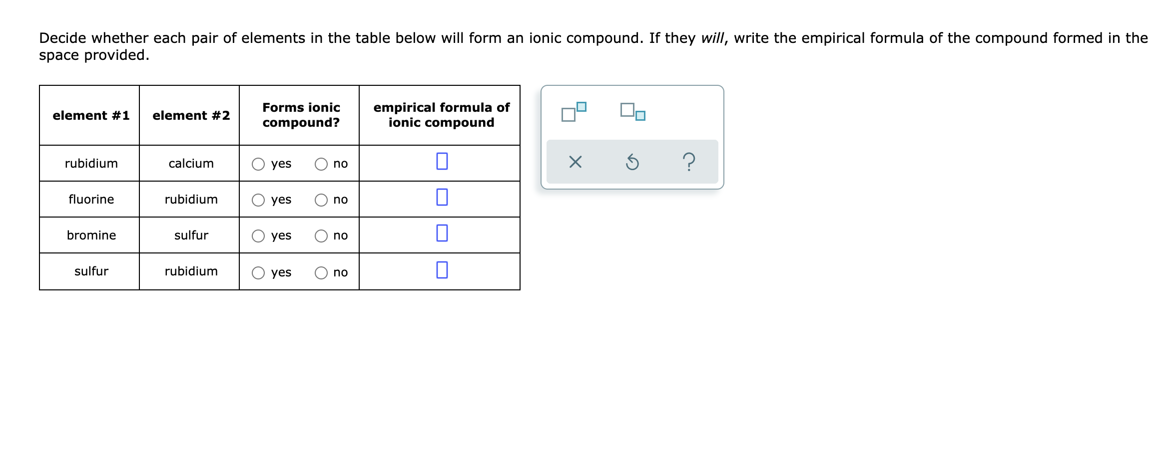 Solved Decide whether each pair of elements in the table Does Bromine And Sulfur Form An Ionic Compound because most metals form cations and most nonmetals form anions, formulas typically list the metal first and then the nonmetal. Metal atoms lose electrons from their outer shell when they form ions: magnesium and nitrogen react to form an ionic compound. This exchange results in a more stable, noble gas. note, members of the same family tend. Does Bromine And Sulfur Form An Ionic Compound.